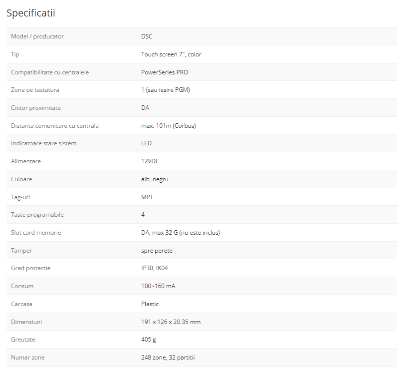Tastatura touch screen 7", color, cablata, rezolutie 800x480, pana la 248 de zone si 32 partitii, cititor de proximitate incorporat, 4 taste programabile, un terminal programabil de maxim 50mA (IN/OUT), posibilitate programare sistem, interfata utilizator, afisare ceas, intrare SD card maxim 32Gb (nu este inclus), functionare ca si rama foto digitala, cablare pe 4 fire pe magistrala Corbus. Compatibila cu PowerSeries PRO.