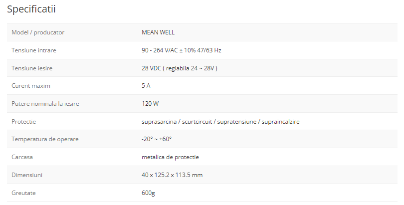 Sursa de alimentare in comutatie MeanWell reglabila intre 24 ~ 28V si un curent maxim de pana la 5A, 120W, sina DIN.